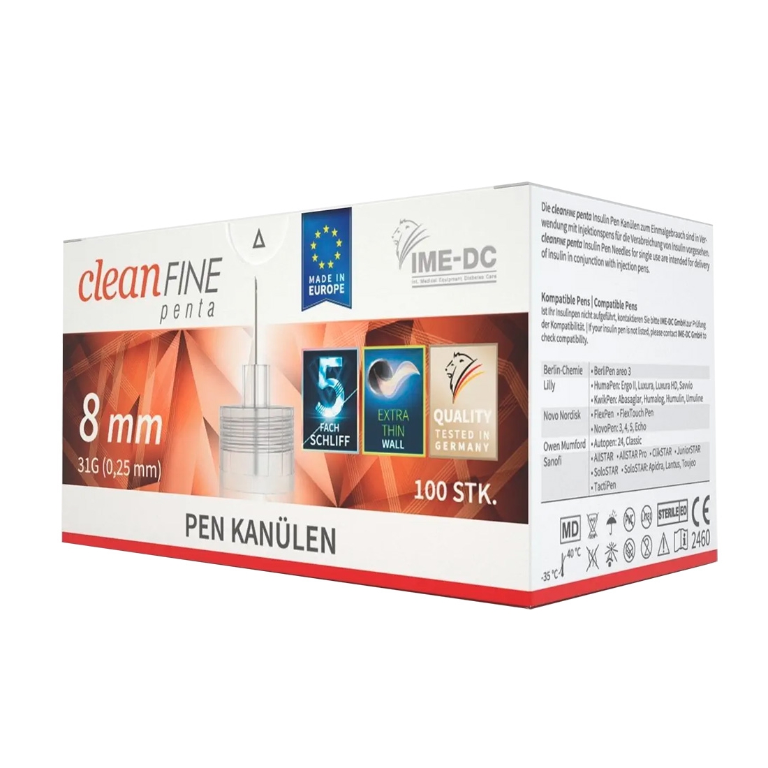 Les aiguilles Cleanfine Penta 8 mm 31G sont des dispositifs médicaux stériles à usage unique, conçus pour l’injection sous-cutanée d’insuline à l’aide de stylos injecteurs.